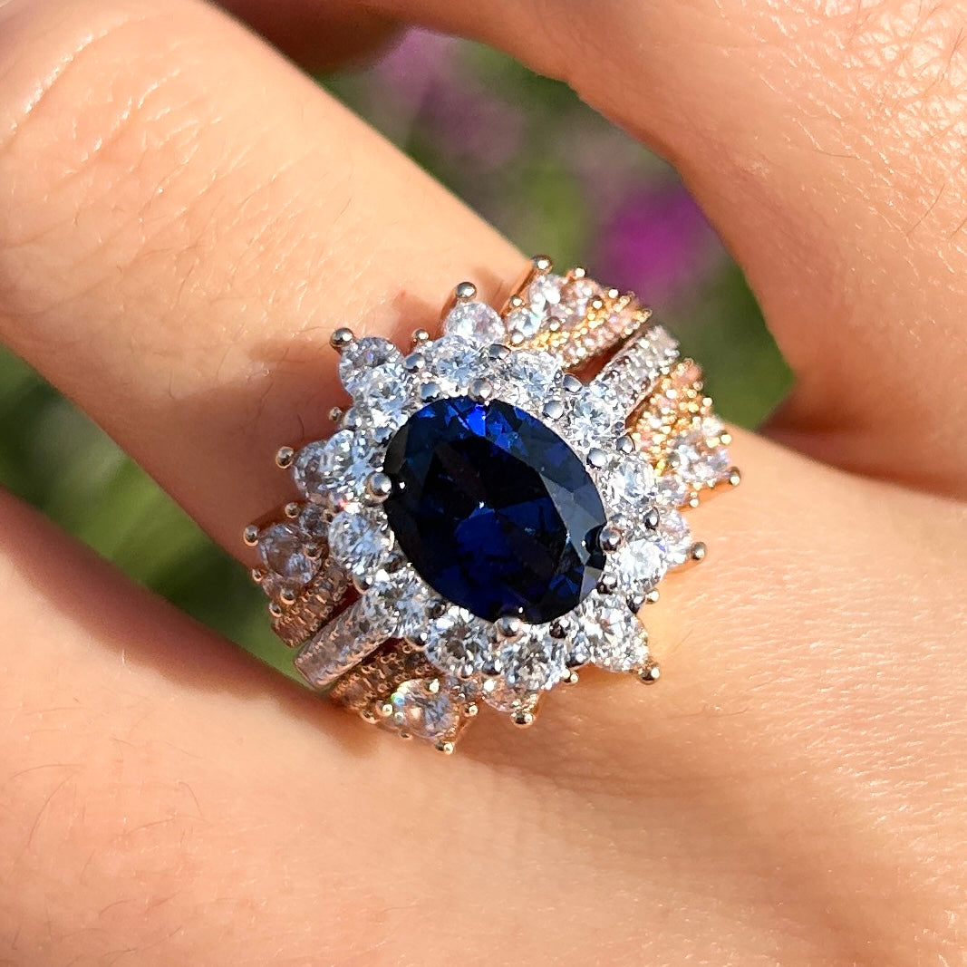 Vintage 2Pcs Blue Oval Cut Halo Sterling Silver Bridal Set