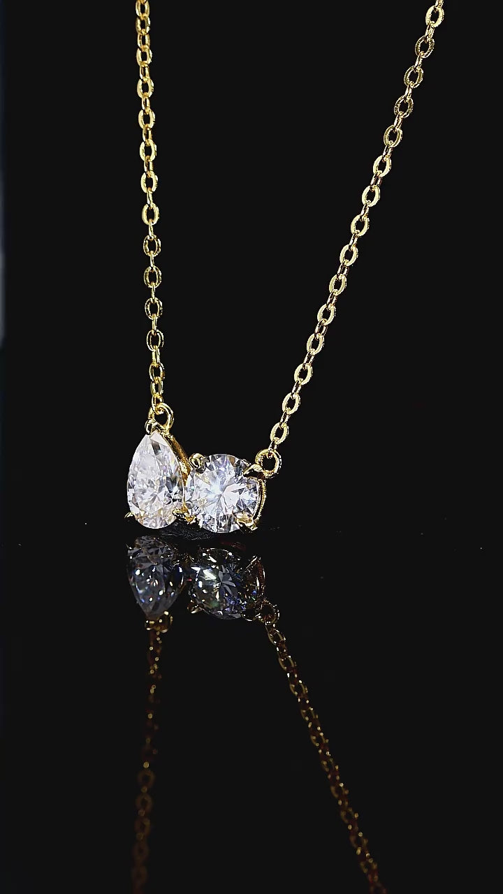 A modern take on timeless elegance — this Dual Spark Moissanite Necklace features two dazzling stones in a graceful asymmetrical design: one pear-cut and one round-cut moissanite, symbolizing balance and harmony.